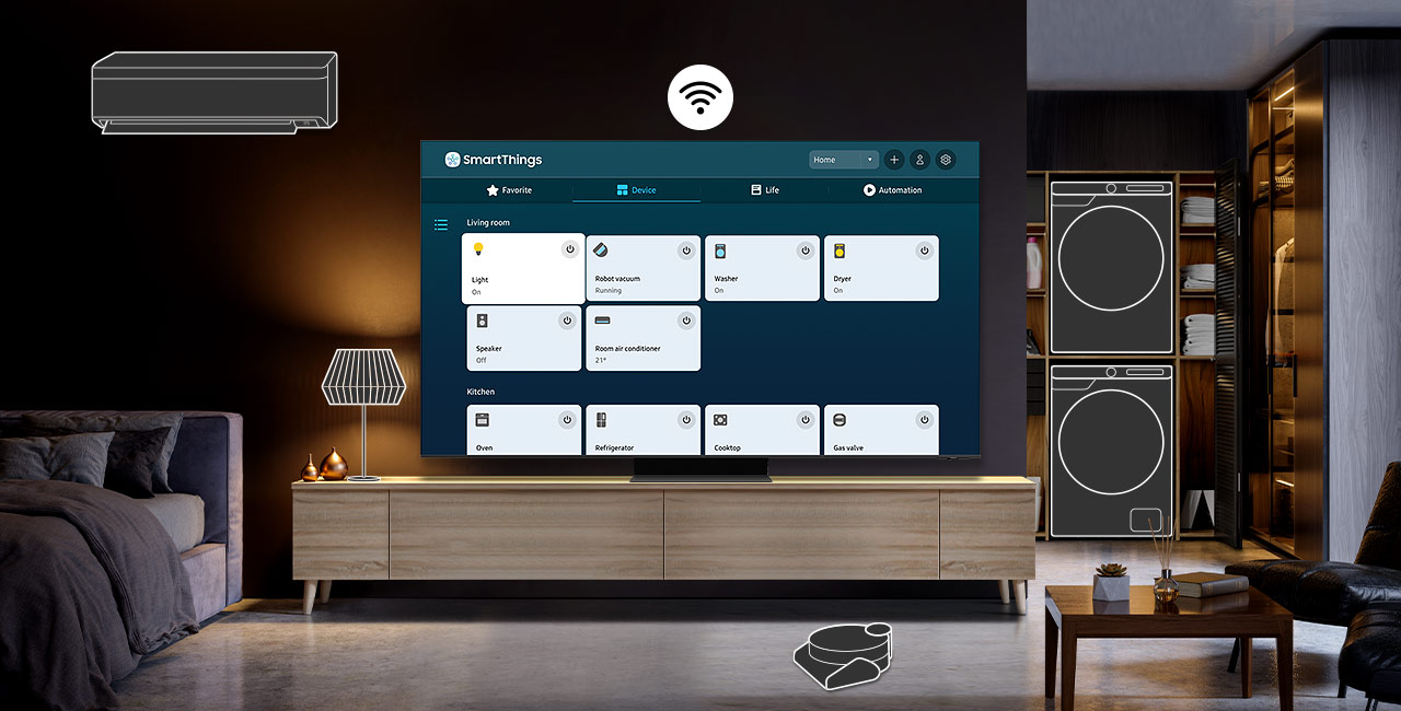 SmartThings kết nối liền mạch, theo dõi và điều khiển tất cả các thiết bị nhà thông minh cho bạn an tâm thư giãn và kiểm tra mọi thứ ngay trên màn hình. Cộng thêm trung tâm IoT tích hợp, mọi kết nối trong nhà được đảm bảo mà không cần thêm thiết bị hỗ trợ.
